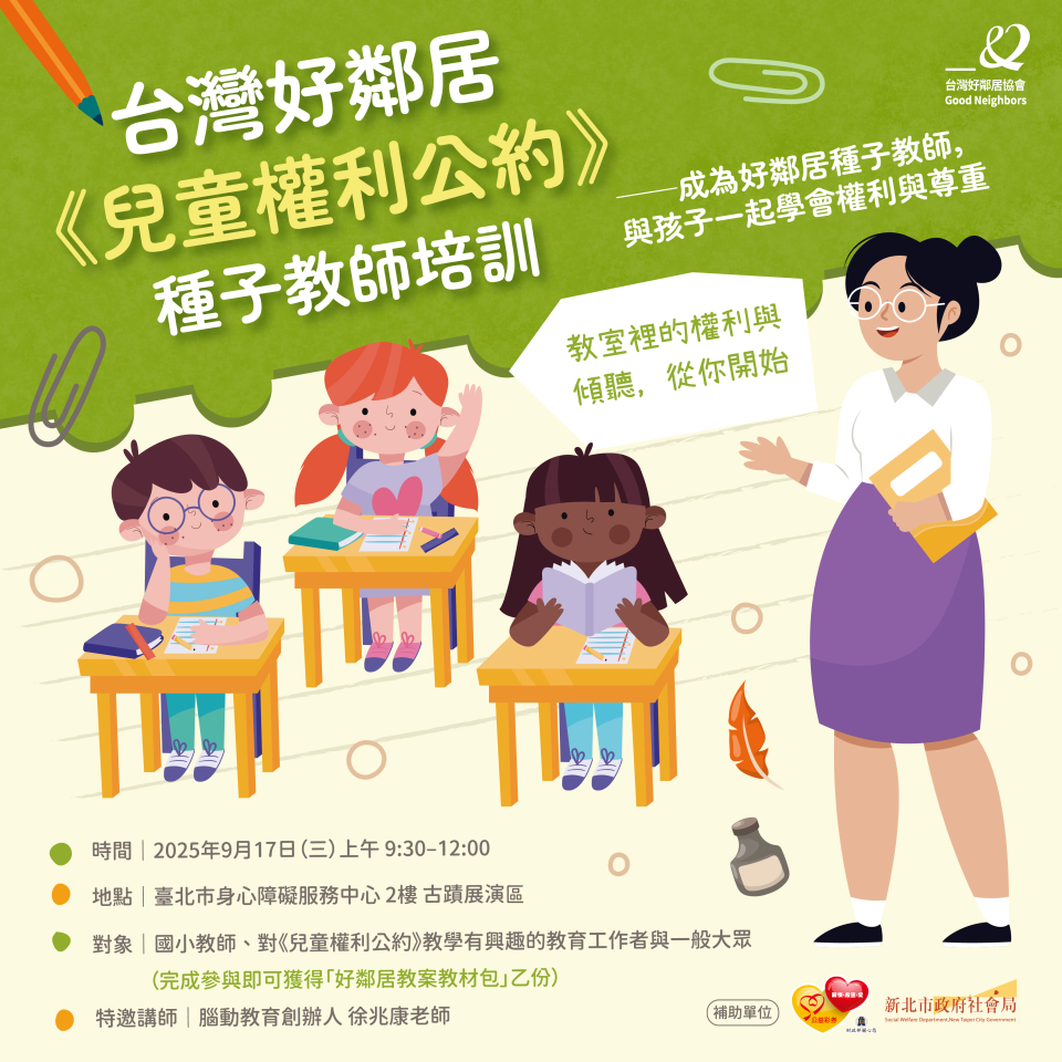在螢幕和訊息不斷干擾的數位時代,「專注力不足」已經成為國小教師最頭痛的挑戰之一。但其實,專注力是所有學習的基礎。沒有專注,孩子很難真正吸收知識,更難深入理解像「尊重」、「傾聽」這些需要內化的價值。 只要方法正確,專注力是可以被引導與培養的!因此,好鄰居特別舉辦這場 《兒童權利公約》進校教學推廣培訓,邀請 腦動 Brain Bump 創辦人 徐兆康 老師 帶來專題演講—— 〈激發專注力的教學策略:讓孩子更投入學習〉